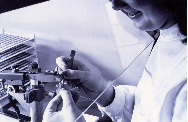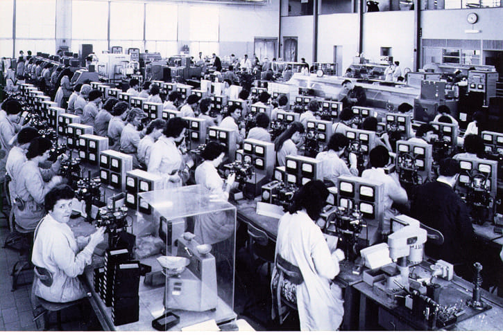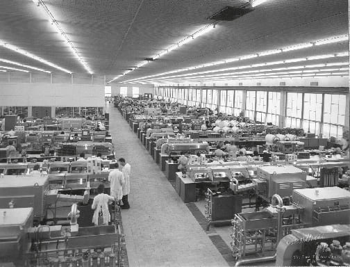 Quel rapport vous dîtes-vous ? Il faut se rappeler que l’électronique des années 50 était très différente de ce que nous connaissons aujourd’hui. En soixante-dix ans, les méthodes et performances ont énormément changé ! Si nous utilisons aujourd’hui des processeurs contenant des centaines de millions de transistors sur un même morceau de silicium, nous sommes alors au tout début de l’ère du semi-conducteur (premiers transistors et diodes sur le marché en 1951) : discrets, de taille assez conséquente et surtout faits à la main. Les ouvrières de la couture sont par conséquent une main d’œuvre très prisée des recruteurs, car peu qualifiée et donc bon marché, peu ou pas syndiquée et surtout très minutieuse. Et ça tombe bien ! Les couturières sont nombreuses dans la région, les structures de formation en place depuis longtemps. Le temps a ensuite passé, les innovations et l’intégration des composants se sont succédés et le site de la rue de la Girafe a connu diverses évolutions pour être aujourd’hui ce que nous connaissons. En un peu plus de 60 ans, les grosses diodes au germanium ont été remplacées par des wafers peuplés de composants passifs d’une épaisseur bien plus fine que les fils que nos couturières de l’époque ont connu !