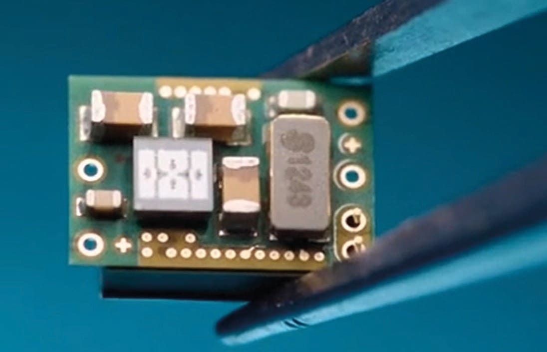 Un zoom sur la petite carte électronique du pacemaker. Sur cette carte se trouve un module contenant un IPD fabriqué par MIS.