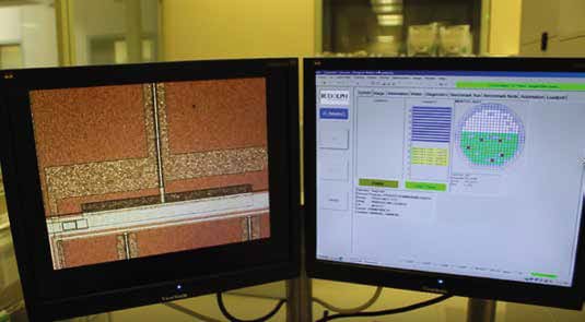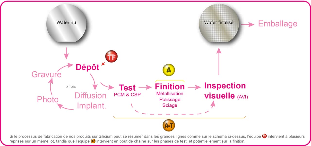Notre cluster se compose de deux secteurs distincts : le Dépôt d’un côté et le Test & Finition de l’autre. Le Dépôt intervient à plusieurs reprises dans le procédé de fabrication Front End. Alors que le Test intervient sur l’ensemble des lots et des plaques qui sont fabriqués, la Finition dépend des demandes et des exigences des clients. La dernière opération que nous effectuons, c’est l’AVI (Automatic Visual Inspection) : nous observons, à l’échelle microscopique et en surface, la totalité des plaques et des circuits pour voir s’il n’y a pas une rayure, une particule. Nous mettons ensuite à jour les fichiers de mapping (coordonnées des bons et mauvais circuits sur chaque plaque).