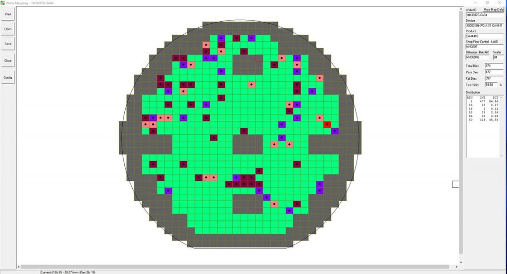 Comme nous l’a expliqué Eric dans son Interview : lorsqu’une plaque est envoyée à un client ou sous-traitant, Murata Caen doit fournir un mapping. Ces données paramétriques correspondent aux résultats des tests électriques réalisées tout au long de la fabrication du produit, elles vont permettre au client de savoir quelles puces utiliser ou non. Le mapping est alors envoyé sous un format électronique correspondant aux besoins et aux attentes du client.