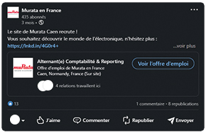 Le groupe Murata possède déjà une page LinkedIn corporate « Murata », en anglais. Afin de faire rayonner notre entreprise sur le territoire français et toucher davantage la cible que nous recherchons pour nos offres d’emplois, l’équipe MarCom a fait le choix de créer une nouvelle page.