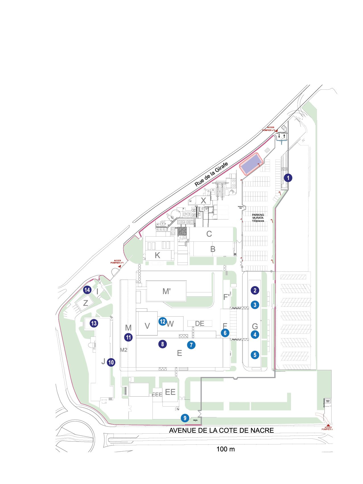 | 1 | L’actuel hangar deux-roues sera maintenu pour abriter les motos. Les vélos auront bientôt un nouveau local (14) qui sera à côté du poste de garde et des futures douches (13). | 2 | La partie Ouest du premier étage du bâtiment G sera rénové ultérieurement |
