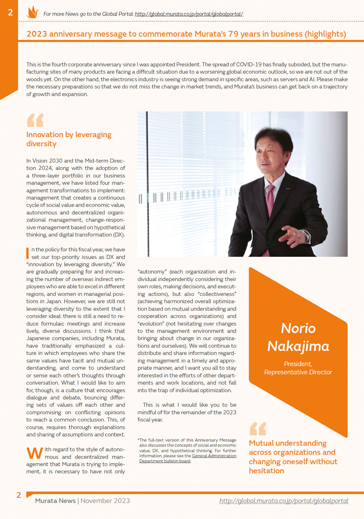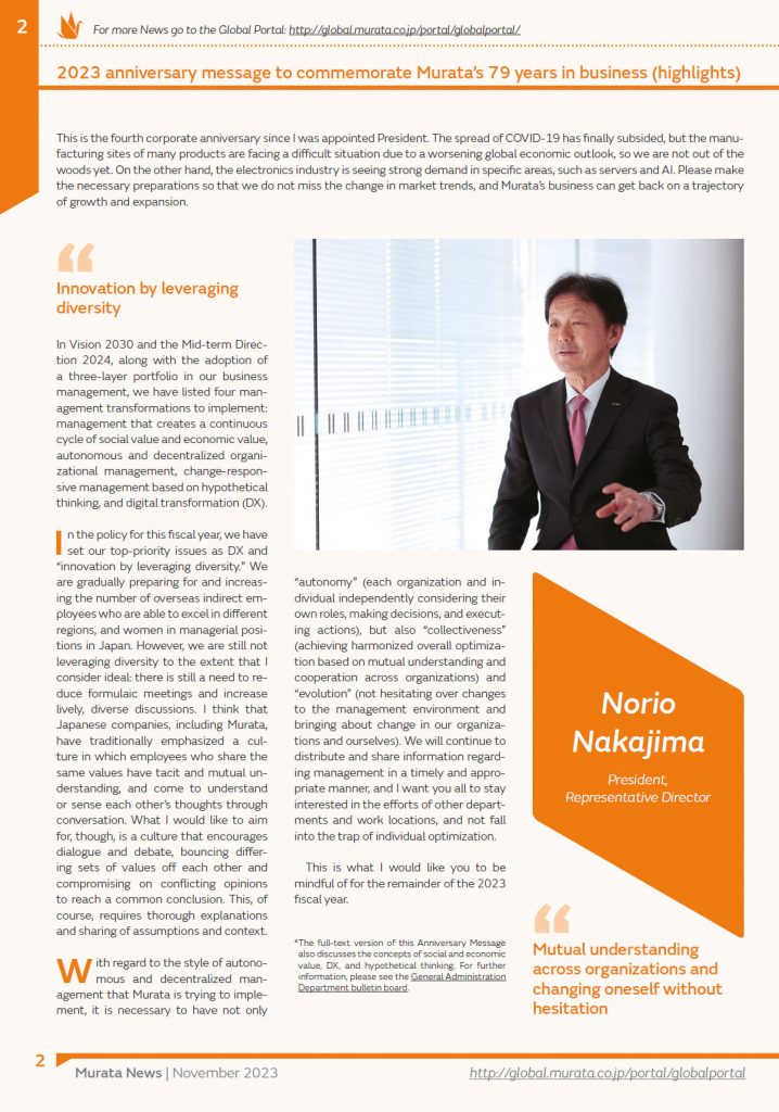 Tandis que le groupe Murata fête ses 79 ans d’existence et Norio NAKAJIMA ses 4 ans de présidence, il reprécise les priorités qu’il a dessinées pour que le groupe prenne les bons virages vers un avenir heureux, et retrouve la dynamique qu’il connaissait avant la période COVID. Nous vous proposons ici un résumé en Français de sa tribune parue dans le numéro de Novembre 2023 du journal interne « Murata News ».