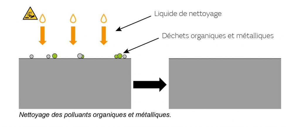 Il s’agit de nettoyer les plaques grâce à une méthode de projection automatique, appelée RCA (nom de code L9001 pour les muratiens), du nom de l’entreprise qui l’a mise en place, et qui se décompose en deux étapes faisant appel à l’ammoniaque, qui vise les composés organiques, et à l’acide chlorhydrique, qui cible les polluants métalliques.
