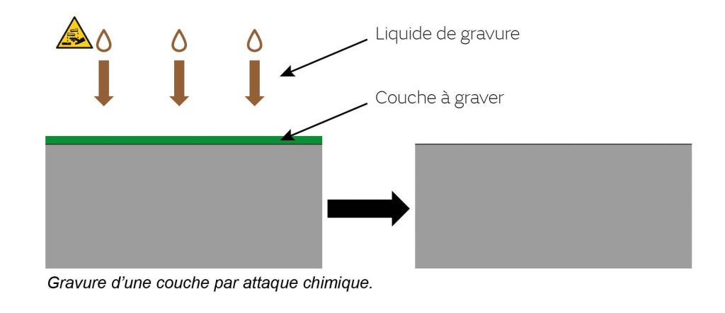 - La gravure totale ou partielle de couches par attaque chimique.
