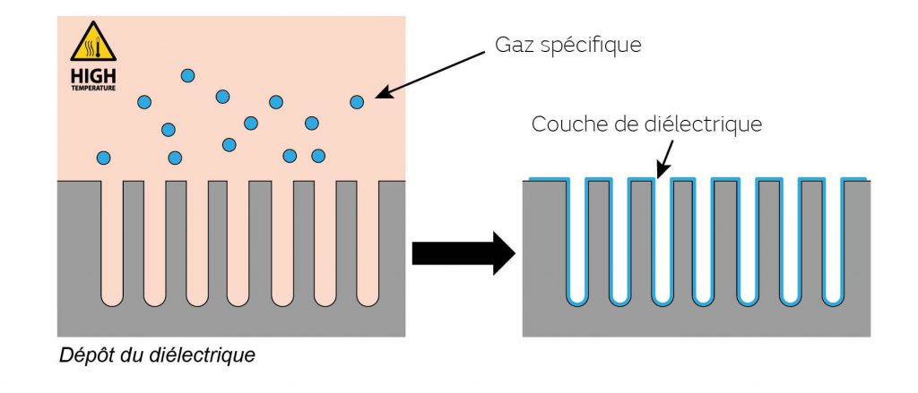 Les condensateurs silicium sont faits de structures 3D (ces structures sont plutôt faites dans le secteur « Dry Etching »), qui sont garnies de diélectrique sur une épaisseur précise, là encore. Pour « tapisser » les cavités, c’est la technologie LPCVD (Low Pressure Chemical Vapor Deposition) qui est utilisée, en mettant les plaques dans une ambiance particulière avec des gaz, une pression et une température spécifiques.