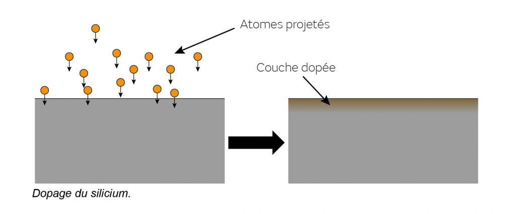 Une des méthodes utilisées est le procédé Implantation qui projette ou « implante » des atomes (sélectionnées pour leurs propriétés électriques dans le silicium) à la surface des wafers, leur permettant de rentrer plus ou moins profondément dans la matière et générant ainsi une couche dite « dopée ».