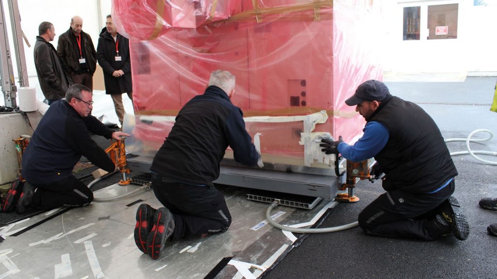 L’installation de l’équipement a duré une bonne partie de la journée : décaissage, mise en place des coussins d’air, déplacement de l’équipement, élévation (pour être à niveau avec le sol de la salle blanche) et enfin son positionnement en salle. Son arrivée en salle de production a été assurée par une dizaine de personnes motivées et gonflées à bloc pour déplacer ces 4 tonnes de technologie.