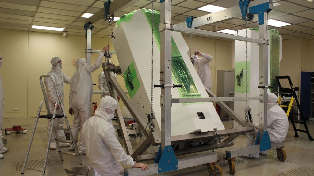 Mise en place d’un portique spécifique pour positionner les plateformes PM1 et PM2 à l’horizontal (hauteur de plafond insuffisante pour le passage à la vertical), et déplacement des plateformes sur leur emplacements.