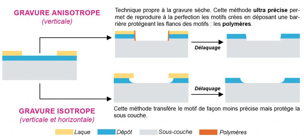 Cette étape est présente tout au long du procédé de fabrication et consiste à retirer une petite épaisseur de matière aux endroits qui ne sont plus protégés par la laque (ces ouvertures dans la laque sont réalisées lors de l’étape de photolithographie aux endroits définis par les masques).