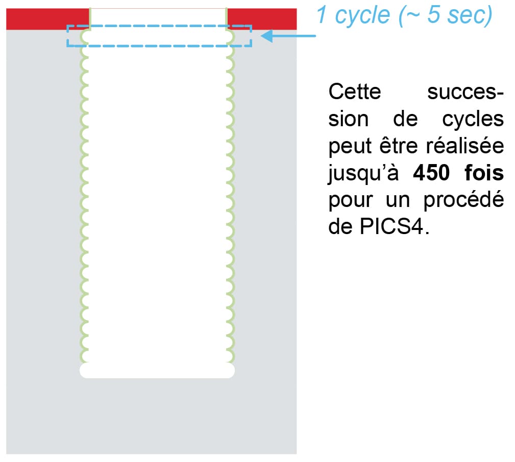 Le programme utilisé pour créer cette structure réalise un grand nombre de cycles d’une durée d’environ 5 secondes pour graver le wafer en profondeur. C’est un procédé inventé par Bosch en 1993 pour fabriquer des structures 3D dans le Silicium. Chaque cycle comprend 3 étapes successives :