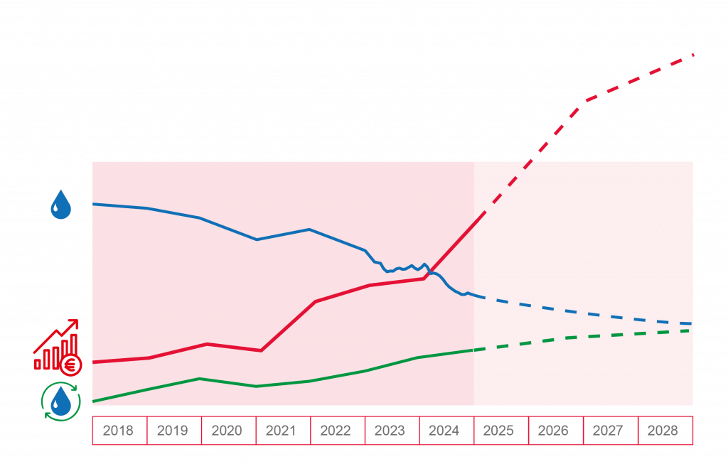 Grâce à tous les investissements et efforts des dernières années, la consommation d’eau baisse alors même que la production augmente fortement.